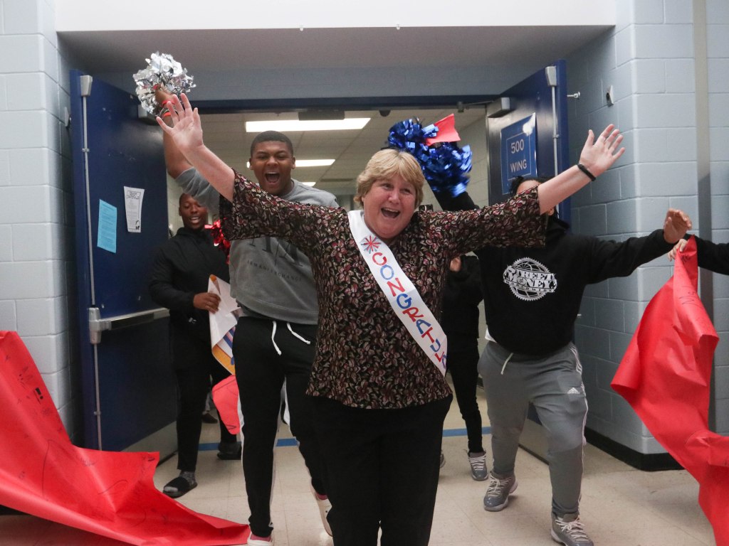 Students filled the hallways and greeted Levine with signs, cheers and even a makeshift float for her to sit on at the middle and high schools.