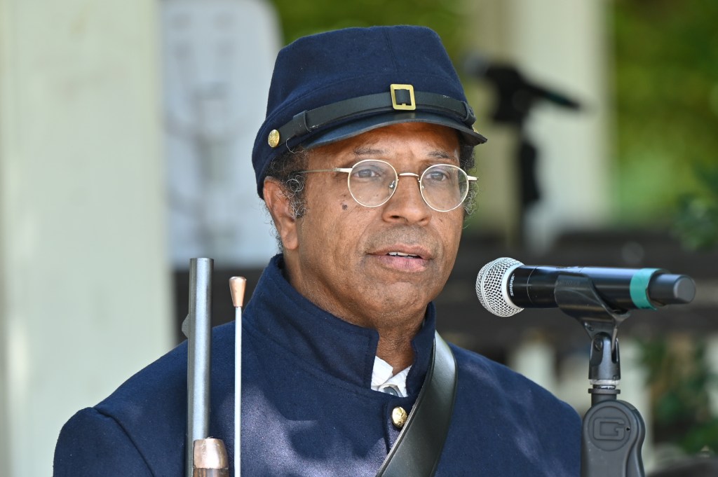 The 66-year-old retired park ranger’s blue outfit demonstrated a historically accurate representation of an 1864 Civil War-era Union Army uniform, complete with a replica musket that he handcrafted himself.